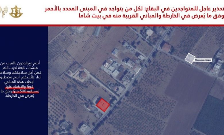 إنذار جديد وعاجل إلى سكان البقاع وتحديدًا المتواجدين في المبنى المحدد في الخارطة والمباني المجاورة له في منطقة بيت شاما