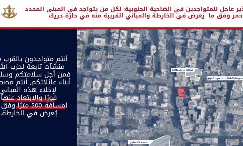 انذار عاجل إلى سكان الضاحية الجنوبية وتحديدًا المتواجدين في المباني المحددة في الخريطتيْن والواقعة في حارة حريك