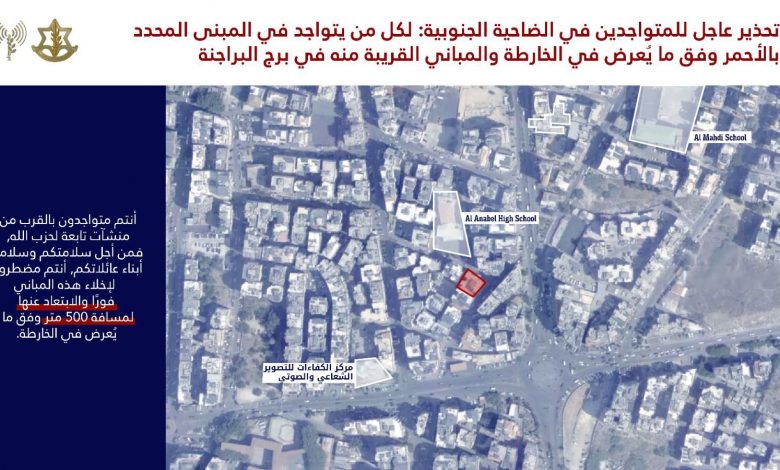 عاجل إلى جميع السكان المتواجدين في منطقة الضاحية الجنوبية وتحديدًا في المباني المحددة في الخرائط المرفقة والمباني المجاورة لها في المناطق التالية: