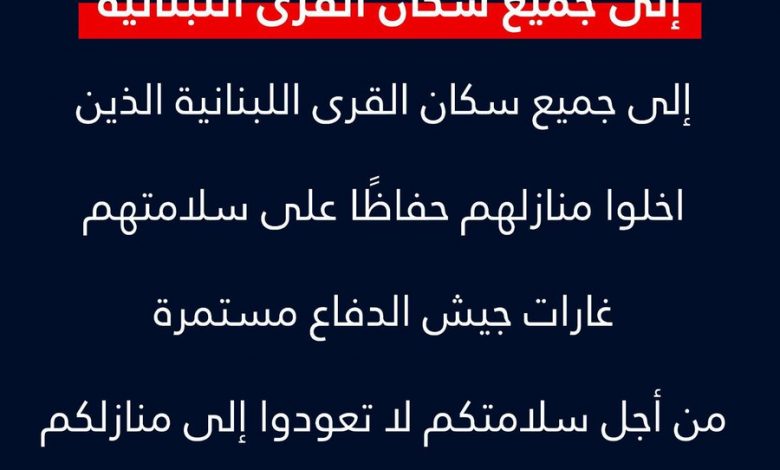عاجل نداء إلى جميع سكان القرى اللبنانية الذين أخلوا منازلهم حفاظًا على سلامتهم: غارات جيش الدفاع مستمرة. من أجل سلامتكم وسلامة أبناء عائلاتكم – لا تعودوا إلى المنازل حتى إشعار آخر