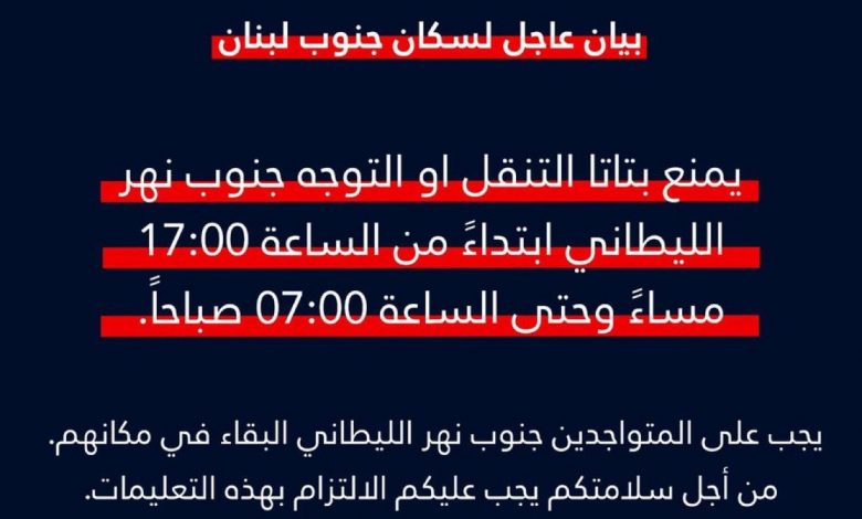 يمنع بتاتًا التنقل أو الانتقال جنوب نهر الليطاني ابتداء من الساعة الخامسة مساء (17:00) وحتى الساعة السابعة صباحًا (07:00) يوم غد.