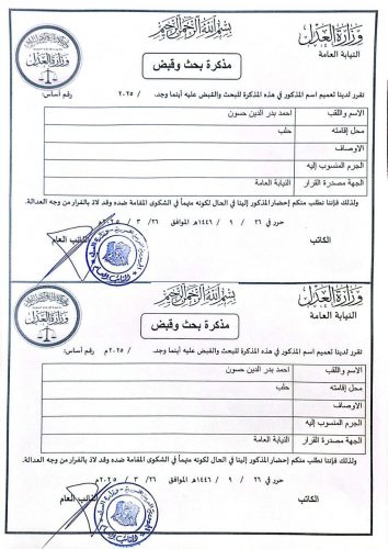 كما تداولت المواقع صورة لمذكرة “البحث والقبض”: