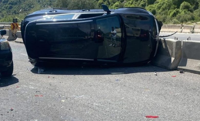 حادث سير وانقلاب سيارة رباعية الدفع على اوتوستراد شكا